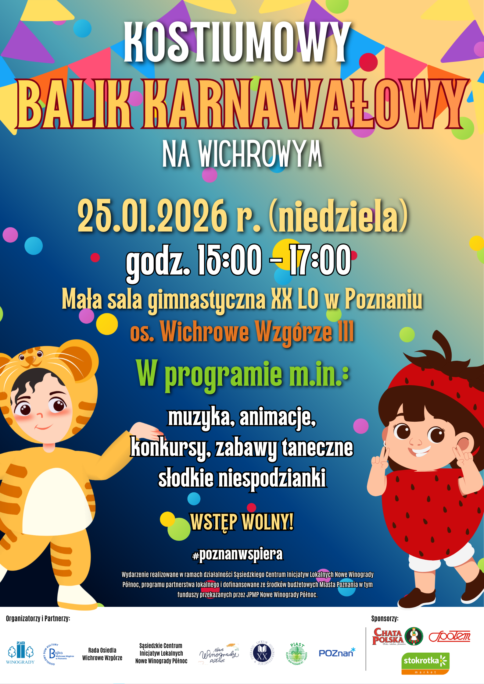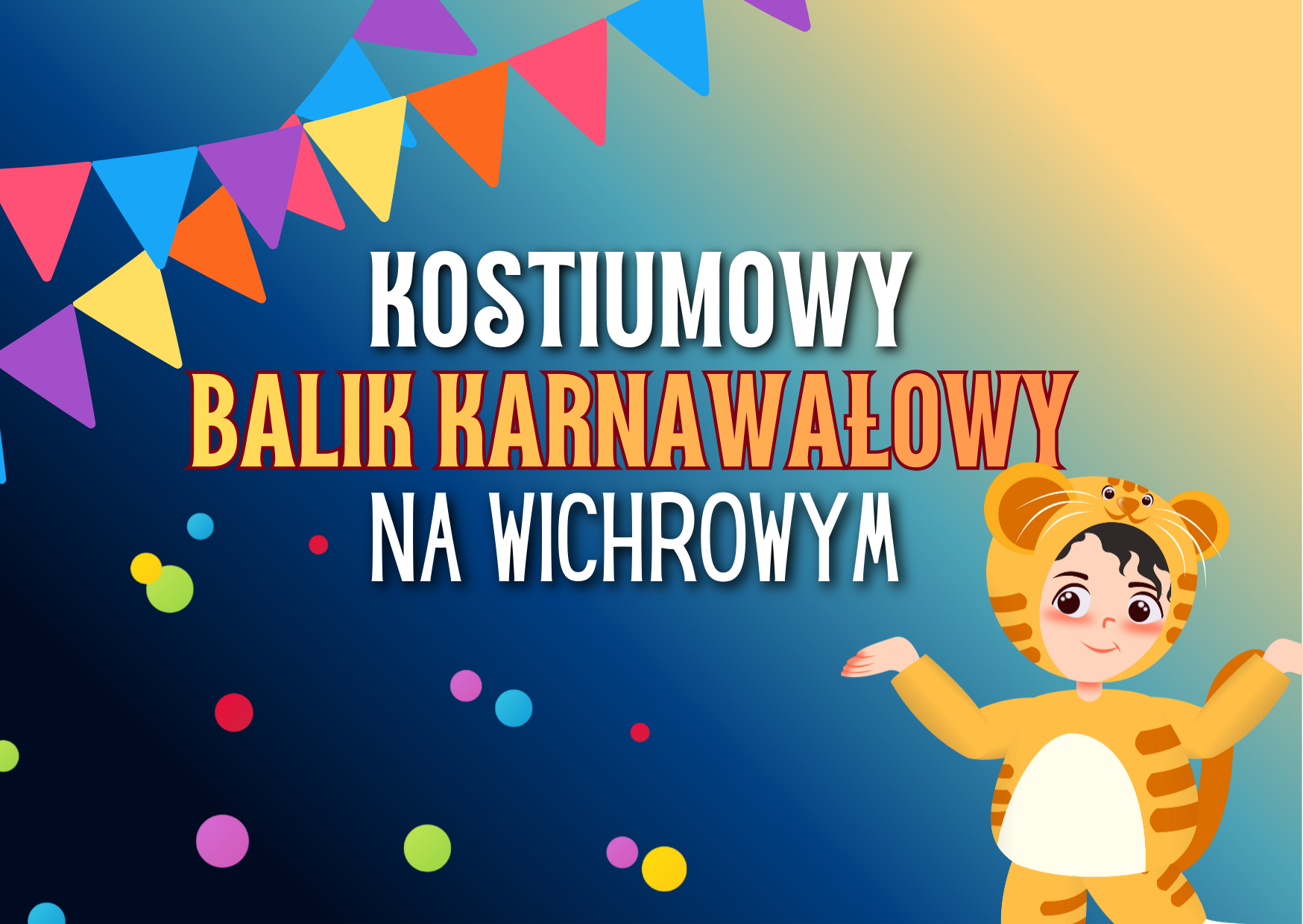 Już 25 stycznia 2026 r. o godz. 15:00 zapraszamy na Kostiumowy Balik Karnawałowy na Wichrowym! To świetna okazja do wspólnej zabawy!