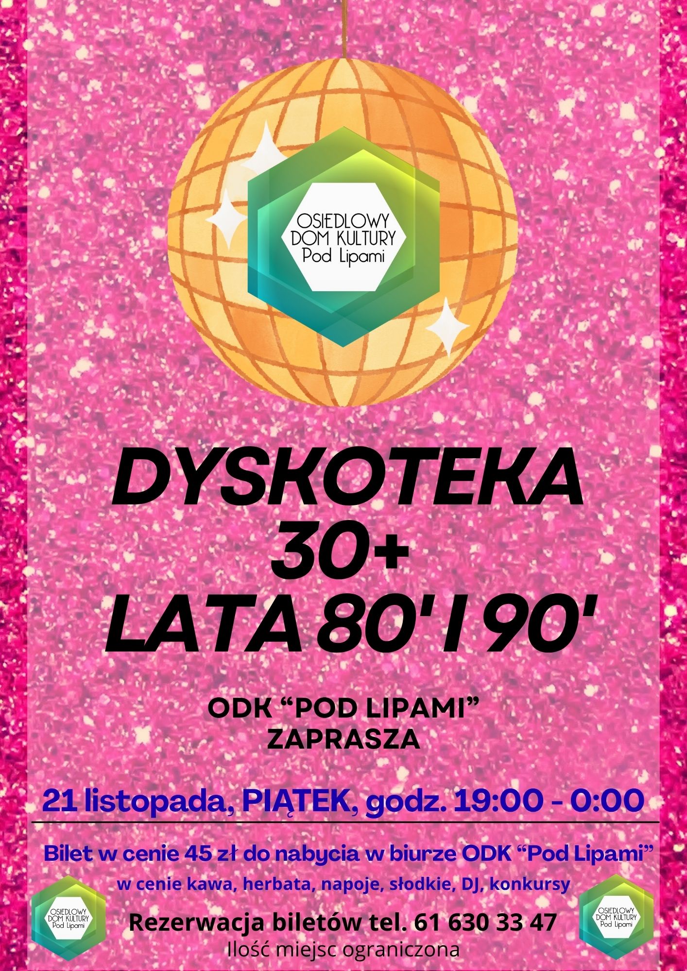 21 listopada (piątek) o godzinie 19:00 zapraszamy na dyskotekę 30+.