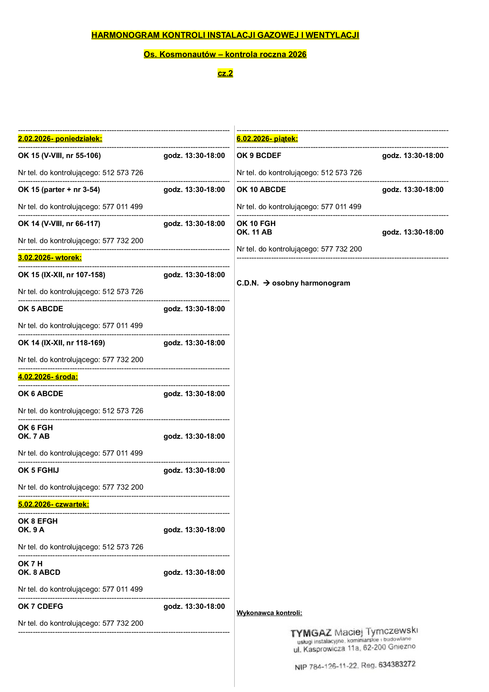 Harmonogram kontroli instalacji gazowej i wentylacji Os. Kosmonautów – kontrola roczna 2026r. cz. 2