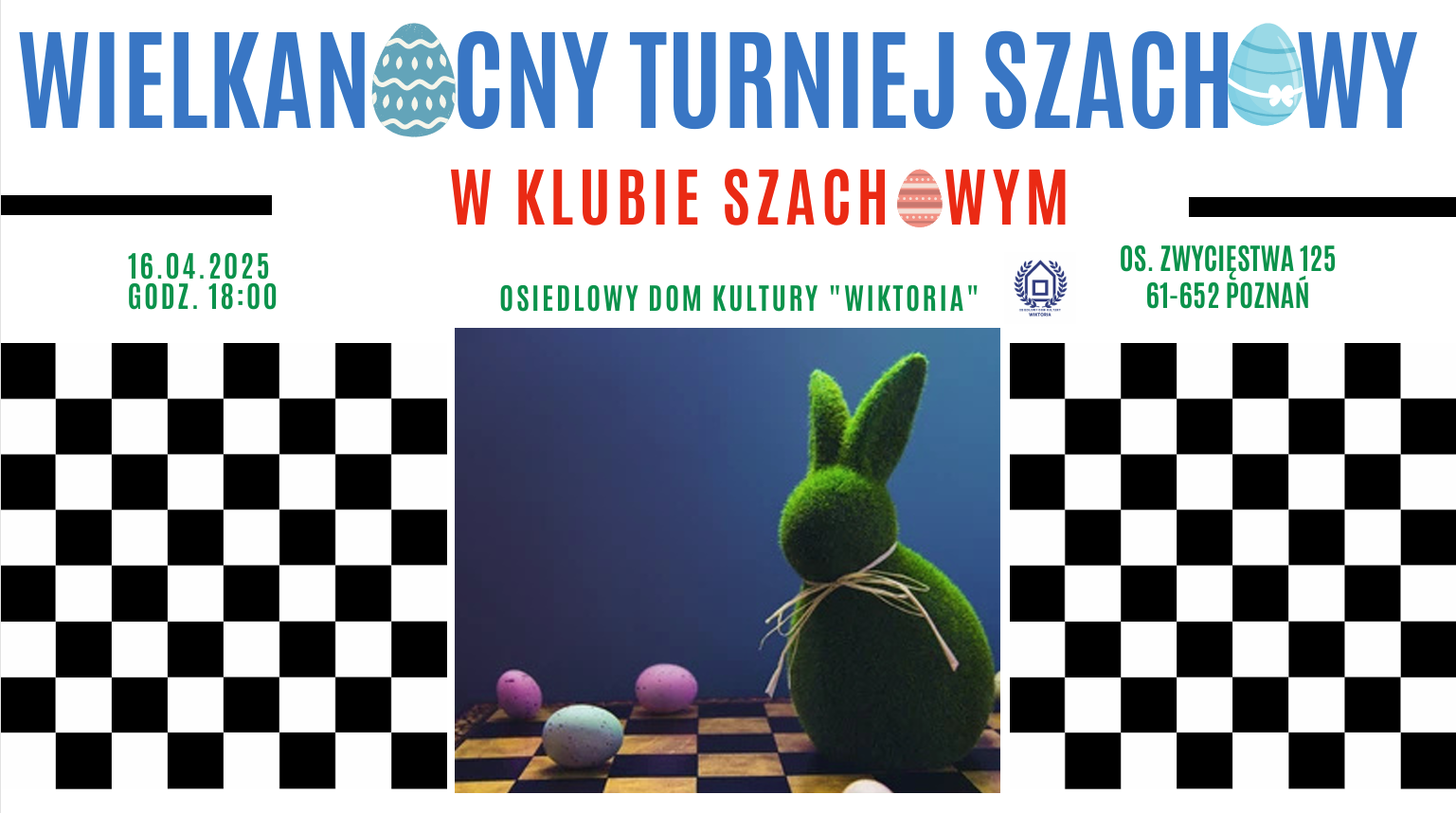 W dniu 16.04.2025 o godz. 18:00 w ODK "Wiktoria" odbędzie się Wielkanocny Turniej Szachowy.