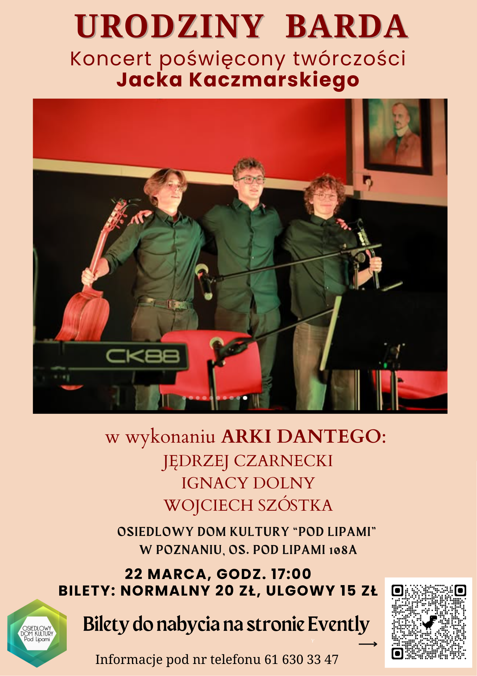 Bilety w cenie 20 zł normalny i 15 zł ulgowy dostępne na platformie Evently: https://app.evently.pl/events/12332-urodziny-barda-koncert-w-rocznice-urodzin-jacka-kaczmarskiego