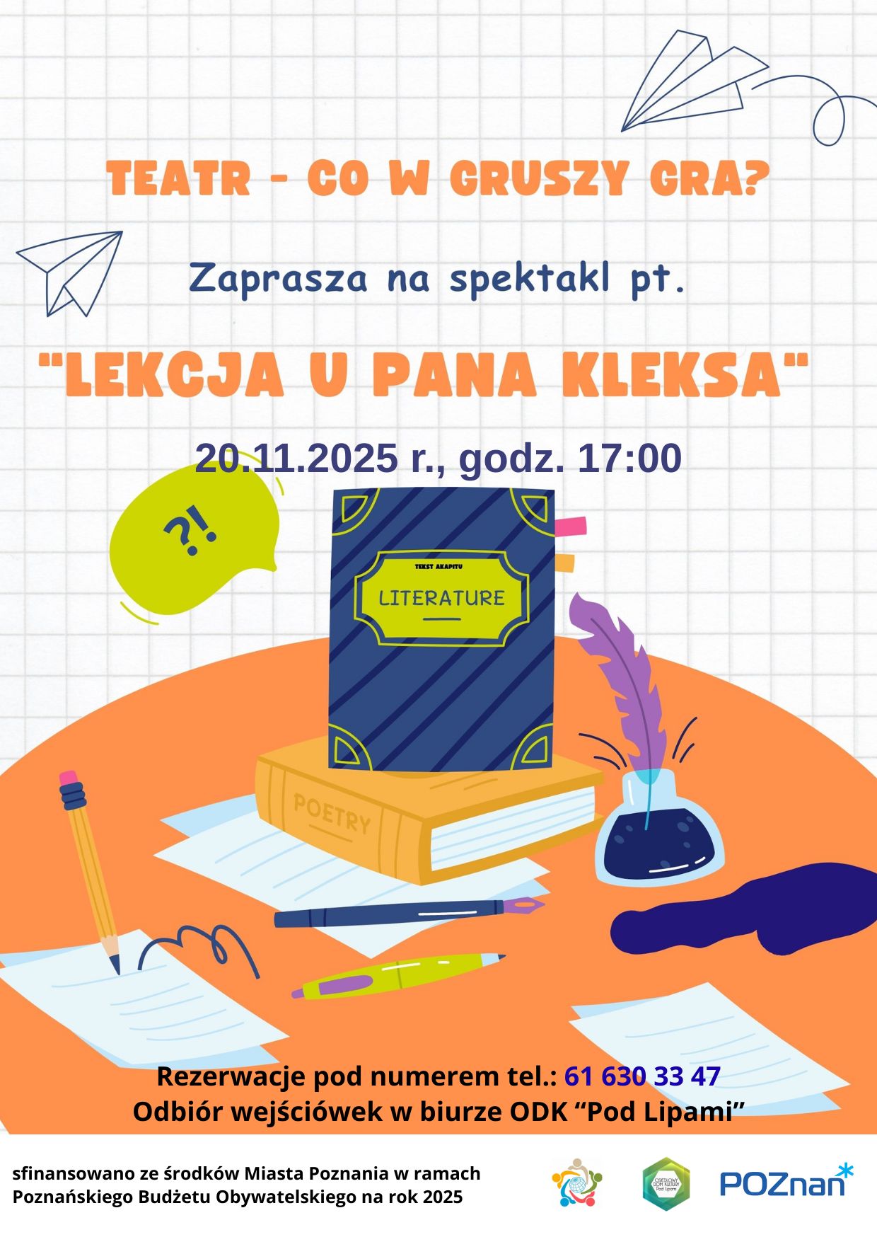 Teatr Młodego Widza, Teatr-Co w Gruszy Gra? „Lekcja u Pana Kleksa” 20.11.2025 r., godz. 17:00 - PSM Winogrady