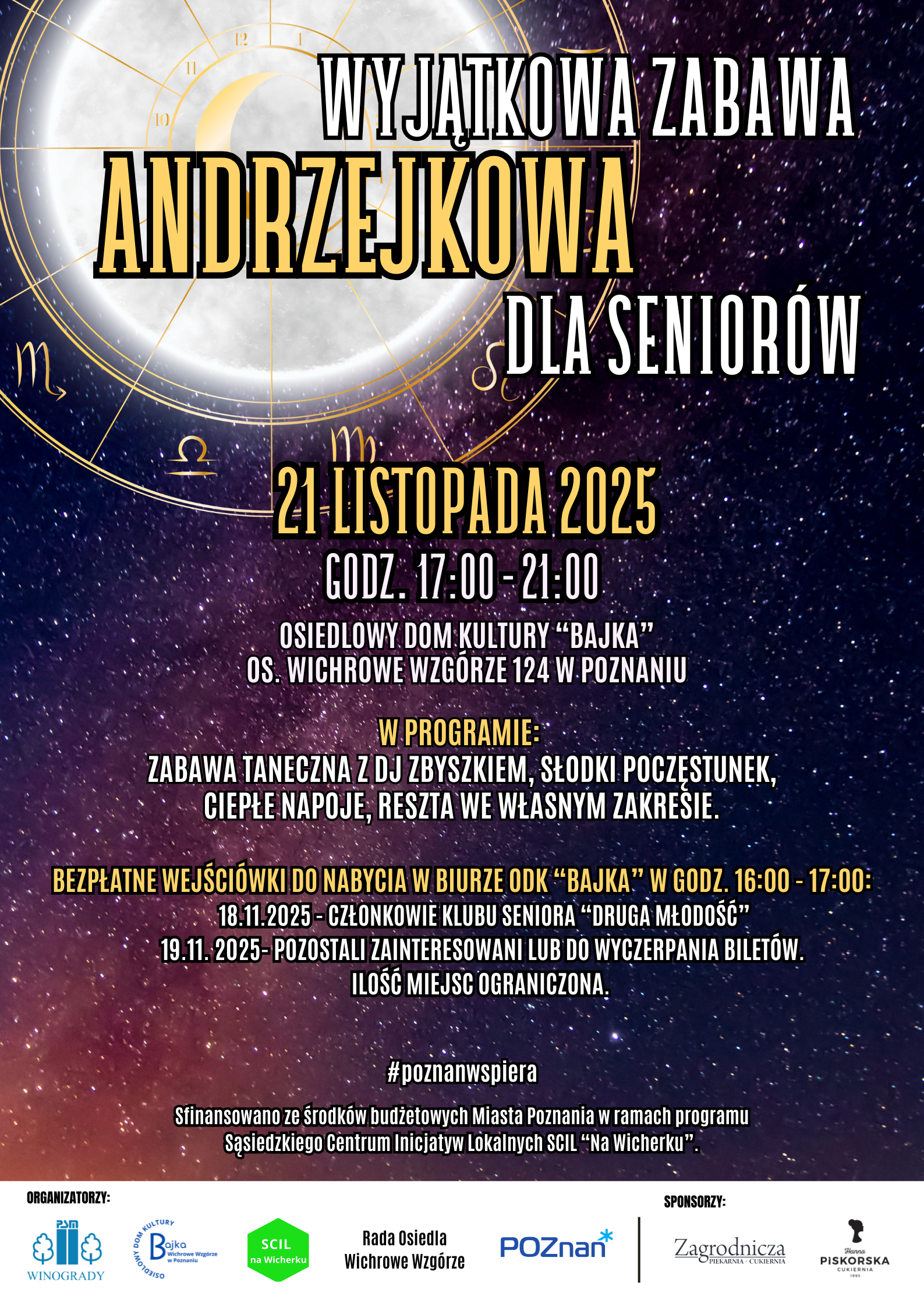Już 21 listopada 2025 r. wspólnie z Sąsiedzkie Centrum Inicjatyw Lokalnych SCIL na Wicherku oraz Radą Osiedla Wichrowe Wzgórze zapraszamy na Wyjątkową Zabawę Andrzejkową dla Seniorów.