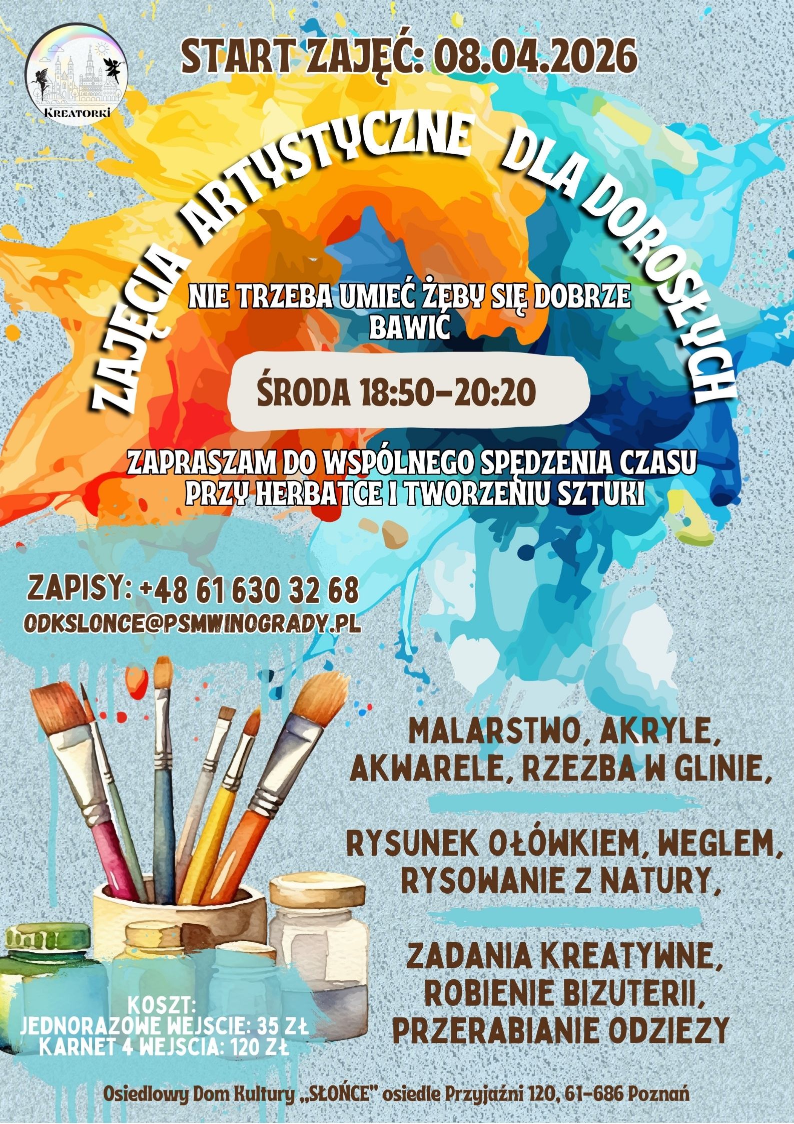 Zajęcia przeznaczone są dla osób początkujących oraz tych, które chcą rozwijać swoje pasje i umiejętności artystyczne w miłej, twórczej atmosferze.